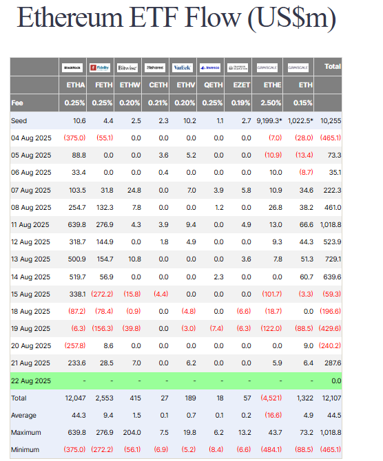 Ethereum surged 10%, breaking $4,350 resistance to test $4,650. Spot ETH ETFs brought in a record $7.88B across July and August, pushing custodial holdings to 6.42M ETH, up 58% since early July. Total ETF and treasury holdings now stand at 10.5M ETH, with whale addresses above 10k ETH also rising, underscoring deepening accumulation. Momentum now points toward a retest of the all-time high at $4,868, with $4,800–4,850 as the next resistance zone.