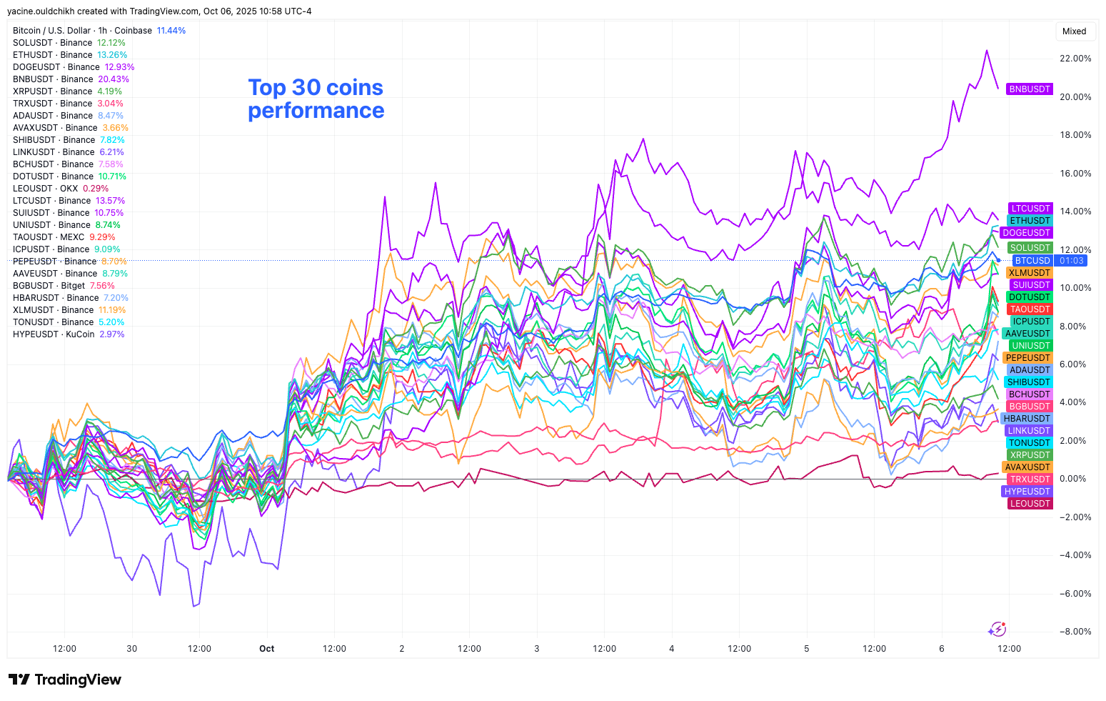 Crypto is still climbing. BTC ran through $125K over the weekend on solid spot demand, a move that looks like traders leaning into rate-cut bets. Total crypto market cap cleared $4 trillion, but most of the action stayed concentrated at the top. Altcoins have been mostly flat to choppy relative to BTC, with few real standouts. BNB is still marching to its own beat. Aster caught attention with a sharp 25% move off Sunday’s lows, but on-chain signals are flashing yellow. Perp volume patterns looked a little too similar to Binance’s XRP flows, fueling concerns about wash trading behind the pop.